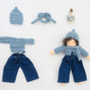 Écharpe et bonnet tricotés main en laine teinture végétale indigo. Fabriqués en France pour mini poupée 17 cm environ.