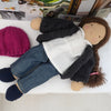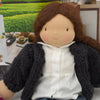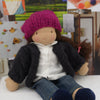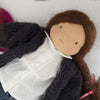 Umeko est une grande poupée brune de 42cm environ de peau couleur café en jersey de coton biologique. Le rembourrage est en pure laine vierge biologique et les cheveux en mohair. Ses yeux sont marron chocolat. C'est une pièce unique cousue à la main par Pénélope en France dans son atelier des Sables d'Olonne. La poupée est habillée d'un jeans, d'un chemisier en popeline blanche à col Claudine, d'un gilet à torsades et d'un bonnet en alpaga tricotés main comme les chaussons en laine. Elle est livrée dans un sachet de coton bio sérigraphié. C'est un modèle déjà fait prêt à être expédié.