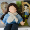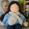 Grande poupée de 42cm environ de peau couleur vanille en jersey de coton biologique. Le rembourrage est en pure laine vierge biologique et les cheveux en mohair brun. Chaque poupée est une pièce unique cousue et brodée à la main en France. De légères variations sont présentes d'un modèle à l'autre attestant d'un travail à la main, artisanal. Elle porte une blouse en lin teinture végétale indigo, un jeans, une écharpe feuille tricotée main en alpaga écru et une petite culotte dans un sachet de coton bio. Prête à être livrée, disponible tout de suite.